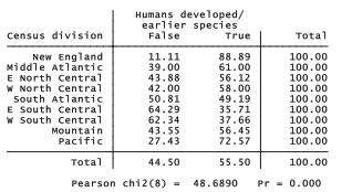 Apart from such individual-level predictors of evolution beliefs, there might be a region-level component as well. Controversies about teaching evolution in schools have been most prominent in the South. Consistent with this impression, a chi-squared test of the GSS data finds significant differences between U.S. census divisions. Acceptance of evolution is highest (89%) among respondents in New England — the states of Connecticut, Maine, Massachusetts, New Hampshire, Rhode Island and Vermont. It is lowest (36%) among those in the E South Central division — the states of Alabama, Kentucky, Mississippi and Tennessee. The Pacific and W South Central divisions are second highest and second lowest, respectively.