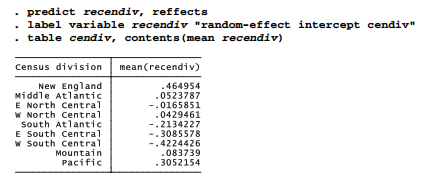 Random intercepts in the output above exhibit significant variation, judging by a likelihood- ratio test versus an ordinary logistic regression (p = .0167), or by the standard deviation of random intercepts (.3376) being more than twice its standard error (.1559). The next commands estimate values for these random intercepts through predict, then make a table showing them by cendiv. Consistent with the earlier chi-squared and indicator-variable analyses, we see positive random y-intercepts (shifting the total effect up) for the New England and Pacific divisions, but negative random y-intercepts (shifting the total effect down) for E South Central and W South Central divisions.