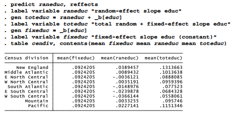 The simplified random-slope model above implies that education has different effects on evolution beliefs in different parts of the country. To see what those effects are, we can predict the random slopes, creating a new variable named raneduc. Total effects of educ equal these random effects plus the fixed effect given by the coefficient _b[educ]. A constant “variable” named fixeduc is generated to display the fixed effects in a table, and a new variable toteduc gives the total effects of education, or the slope on educ within each census division.