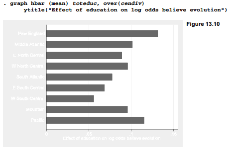 We see that education has a positive effect on the log odds of accepting evolution across all census divisions. Education effects are much stronger, however, among respondents in New England or Pacific states compared with the E or W South Central.