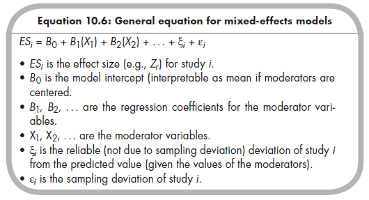 Mixed-effects models follow the logic of moderator analyses within a general regression framework (see Chapter 9.3). However, these models include additional terms representing population variability in effect sizes, above and beyond systematic variability accounted for by moderators as well as sampling fluctuations. The general equation for mixed-effects models can be represented by the following equation: