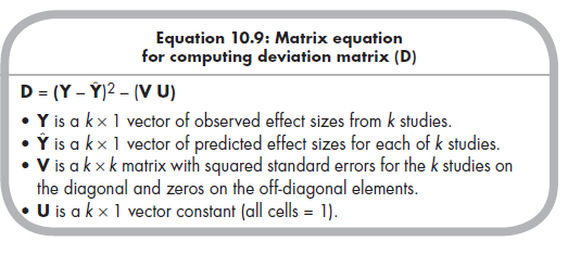 You then consider the discrepancies between the actual (observed) effect sizes of the studies and these predicted (by the intercept and any moderators) values. Specifically, you compute a matrix, D, representing k squared deviations that serve as estimates of the population conditional variance (t2):
