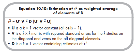 reestimated using Equation 10.10 (using V*). This process continues until the estimated t2 changes minimally between successive iterations. Although the convergence criteria have not been well studied, Overton (1998, citing Erez et al., 1996) suggested that A t2 less than 10-10 is adequate and usually achieved by the seventh iteration. Using the example meta-analysis of 22 studies, I achieved this level of convergence in six iterations.