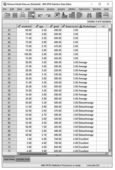 Mixture modeling is a type of modeling where data is divided into subgroups and classified. Using a Bayesian analysis, all data that is unclassified will then be assigned to a group based on the existing criteria of the data that has already been assigned. For instance, let’s say we are trying to classify the type of academic student for a master’s program admission. We want to know what criteria we can use to predict if an applicant will be a good student.To do this, we have to create some “training data”. We have 100 students that have already gone through the program, and at graduation they were classified as either “Excellent”, “Average”, or “Below Average”. Next, we need to see what categories or criteria we can observe before a potential student starts the program that can help us understand the likelihood a student will be clas- sified as Excellent, Average, or Below Average. The master’s program director thinks there are three criteria that can help project how successful an applicant would be in the master’s program. These three criteria are GPA from their undergraduate degree, what they scored on the GMAT test, and what letter grade they received on the principles of finance course in their undergraduate degree. Again, we are examining criteria that could help classify a student before given admittance.The goal is to avoid admitting “Below Average” students. In our train- ing data, we will need to input the GPA, GMAT, and finance scores for each student that has been classified.