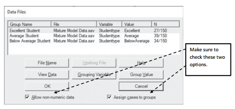 After getting your training data and new data in SPSS, you are ready to go to AMOS. In AMOS, you are going to create three groups.You will have a group for each category or clas- sification of student (Excellent, Average, and Below Average).You will then need to read in the data for each group. The different classifications will often be in one file, so you will need to select the grouping variable and find the column name the classifications are in (Studenttype is this example). After that, you can select the “Group Value” and choose the classification for each group. See Figure 10.16. On this data file window, make sure to click “Allow non-numeric data” and “Assign cases to groups”; otherwise, AMOS cannot read the classification of each data row. As well, you want AMOS to assign unlabeled data to a group with mixture modeling. If you do not select these, you will get an error message.