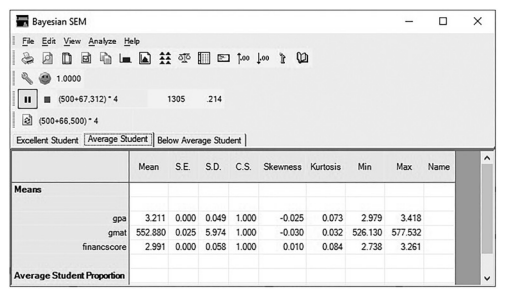 The Bayesian window will provide a lot descriptives about your classifications.There is a tab at the top of the window that will allow you to see the information for each group.You can see the “Average” student has a mean GMAT score of 552, a GPA of 3.21, and an average finance score of 2.99 on a 1-to-4 scale. As well, the analysis will give you the maximum and minimum score to classify as an “Average” student. In the Below Average group, the initial results show that students that have a GPA less than a 2.50 and a score under 500 on the GMAT have a high probability of being classified as a below average student.