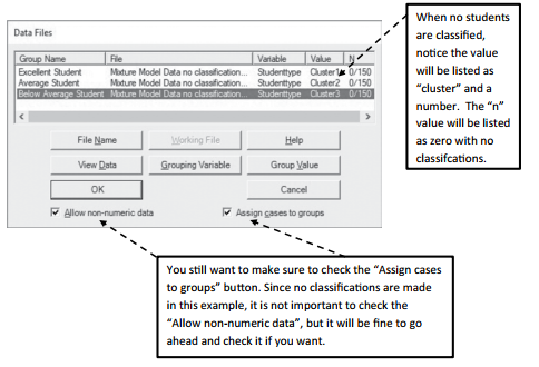With mixture models, you can also let AMOS classify all the data (with no training data). In this example, you would set up three groups in AMOS.When you read in the data for each group, you will choose a specified classification column even though it is blank. In this exam- ple, let’s choose the column “Studenttype” as in the previous example, except now there are no classifications in the column. AMOS will just list the values for this column as “cluster” and a number.