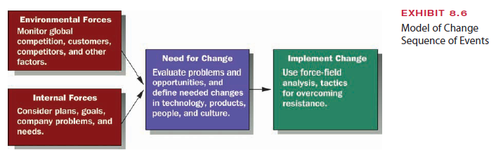An overall model for planned change is presented in Exhibit 8.6. Three events make up the change sequence: (1) internal and external forces for change exist; (2) organization managers monitor these forces and become aware of a need for change; and (3) the required change is implemented. How each of these activities is handled depends on the organiza- tion and managers’ styles.