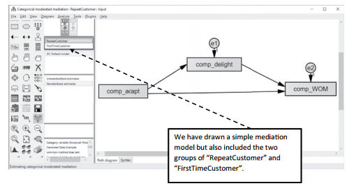 In the preceding example, we explored moderated mediation with a moderator that was continuous. Let’s now examine how moderated mediation is performed when the mod- erator is a categorical variable. With a categorical moderator, we will not be forming an interaction term but will be assessing the moderator with a two group analysis. Let’s go back to our simple example, Adaptive Behavior will influence feelings of Customer Delight which will influence Positive Word of Mouth intentions. The categorical modera- tor will be if the customer was a first-time customer or a repeat customer. In the data, the column “experience” has the repeat customers listed as a 1 and the first-time customers listed as a 2. We are going to draw our simple mediation model but also create separate groups for our moderator. For more information on setting up groups in two group analysis, see page 149.