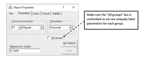 Now that we have drawn our model and created the groups, we need to label the param- eters for each group. The labels need to be unique for each group. The reason we are labeling the parameters is because we are going to use the estimand function to help determine if moderated mediation is present. Let’s select the “FirstTimeCustomer” group and then select (double click) the parameter from Adaptive Behavior to Customer Delight. This will bring up the Object Properties box where we will label this path the “A_Path”.You can call it any- thing you like; the name is arbitrary. By default, a checkbox on the Object Properties page is selected, called “All groups”. If this box is selected, it will use the same label name for this parameter across all the groups. We want to label all parameters uniquely across the groups, so uncheck this box.You will have to uncheck the box with each parameter you are trying to label in the first group.