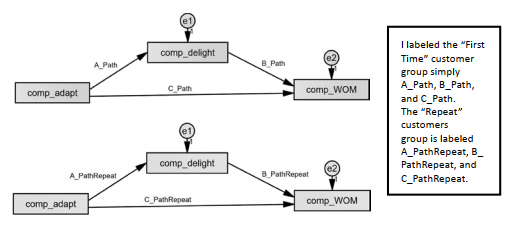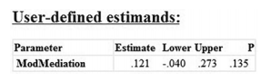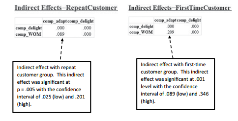Note that both of the indirect effects are significant for each group but the difference between the indirect effects is not significant, noting that moderated mediation is not present. One thing to remember is the difference of indirect effects will be dependent on how you order the groups in the estimand function. Our moderated mediation difference could have easily been −.121 if we would have subtracted the first-time customer group from the repeat customers. Just be mindful that the sign of the effect is dependent on the groups and which one is listed first in the estimands window.