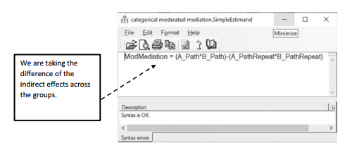 In the estimands function, we want to define a new estimand. I will call the test “ModMediation”. In the estimands function, I am going to find the indirect effect for the first-time customer group (A_Path*B_Path) and then I am going to specify the repeat customer group (A_PathRepeat*B_ PathRepeat). I am going to subtract the indirect effect of the repeat customer group from the first-time customer group.This function will give us the difference of the indirect effects.