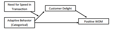 So far, we have examined multicategorical independent variables in a simple structural model test and then a mediation test. Let’s extend our example now to assess moderated mediation with multicategorical independent variables.We are going to use the same example as before, except this time we will add a moderator. The moderator in this test is a construct called “Need for Speed in a Transaction”, and in order to simplify things, let’s just call the construct “Speedy”. This construct represents a customer’s need for a speedy service experience. In other words, how fast or slow does the customer want the experience to take place.The speed of the service experience can influence the customer’s desire to adapt a service. Adaptation can often slow down the service because you are leaving a normal manner of operations to adapt the service to the customer. This moderator is proposed to work in a negative manner with the relationship of Adaptive Behavior and Customer Delight. When a customer is high in Need for Speed, then the relationship from Adaptive Behavior to Customer Delight will be weakened. Conversely, if a customer has a low Need for Speed, the Adaptive Behavior to Customer Delight should be strengthened. See the graphic representation that follows.