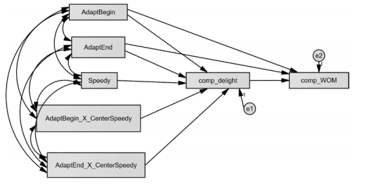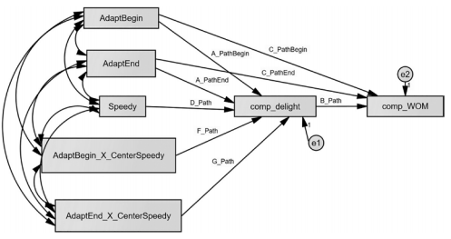 To set up this test, we are going to dummy code the categorical variable again. We are going to use the same names for the constructs as before. Since we are testing modera- tion with a continuous variable, we need to form an interaction term. The first thing you need to do is mean center the moderator. Since the independent variables are dummy coded to ones and zeroes, there is no need to mean center those variables. After you have cen- tered the data with the moderator, you need to create an interaction term for both of the dummy coded independent variables (AdaptBegin and AdaptEnd). I will call these varia- bles “AdaptBegin_X_CenterSpeedy” and “AdaptEnd_X_CenterSpeedy”. Once we have the interaction terms created in SPSS, then you are ready to draw the model in AMOS. See Figure 8.19.