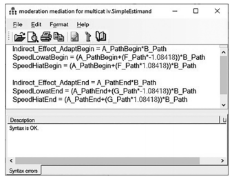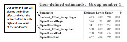 We now need to use the estimands function in AMOS to determine the indirect effect and how it changes with the moderator. We are initially going to examine the indirect path for each categorical variable. We are then going to probe the interaction of the indirect effect. The standard deviation for our moderator (Need for Speed) was 1.08418. Now we are going to probe when the moderator is low for the first categorical variable of Adapt- Begin. To do this, we take the interaction estimate (F_Path in this example) and multiply that by the standard deviation to get the effect at one standard deviation above the mean. We are also going to multiply the negative of the standard deviation to get the effect that is one standard deviation below the mean. This revised interaction term will be added to the “A_Path” and then multiplied to the “B_Path”. I know that might sound complicated, but it is really pretty simple when you see it in the estimand window (Figure 8.21). To test the indirect effect at high levels of the moderator (Need for Speed), the name “SpeedHiatBegin” will be used as the name for the test when adaptation at the beginning group is compared to the no adaptation group.The other categorical variable of adapting the service at the end of the experience has a test name of “SpeedHiatEnd”. The low level of the moderator in the indirect effect is similarly named of “SpeedLowatEnd” and “SpeedLowatBegin”. Notice that with the moderator going one standard deviation below the mean, we need to have the sign as a negative.
