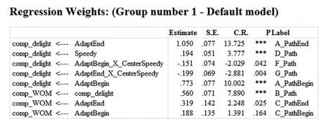 In the Estimates link of the output, you can see the regression estimates for each path in the model. From this analysis, we can see that both the categorical variables have a positive and significant relationship to Customer Delight. Remember the regression coefficient for the dummy coded category variables is simply a difference of mean from the Customer Delight variable across the groups. The results also show us that the interaction term for both the “AdaptBegin” and “AdaptEnd” to Customer Delight is negative and significant. This lets us know that the Adaptive Behavior to Customer Delight relationship is weakened in the presence of the moderator (Need for Speed). Lastly, you can see that the direct effect from the “Adapt- Begin” construct is non-significant but that the direct effect from “AdaptEnd” is significant.