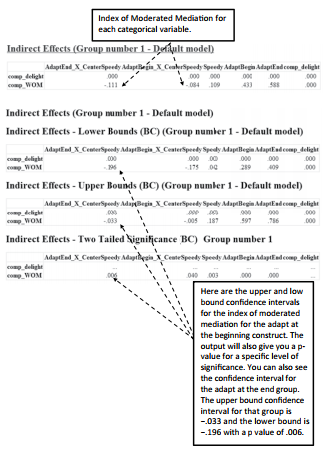 From our user-defined estimand, we have examined the indirect effect in the presence of the moderator. At this point, we need to assess if the moderator significantly moderates the indi- rect effect.This will be accomplished by examining the index of moderated mediation for each categorical variable in the model.The index of moderated mediation is the path from the inter- action variable to the mediator multiplied by the path from the mediator to the dependent vari- able. If we go to the “Estimates” link in the output, then go to the “Matrices” option, and then select indirect effects (make sure the indirect effects option is selected in the Analysis Proper- ties window), we see the indirect effect for AdaptBegin_X_CenterSpeedy and Positive Word of Mouth is −.111. The indirect effect for AdaptEnd_X_CenterSpeedy and Positive Word of Mouth is −.0842. If you go to the Bias-corrected percentile method on the left-hand side, you can see the bootstrap confidence intervals for both of those indirect effects. In this case, they are both significant. The negative value lets us know the slope is moving in the opposite direction or specifically that the indirect effect is weakening. The significance of the index of moderated mediation lets us know that, yes, moderated mediation is taking place in the model.