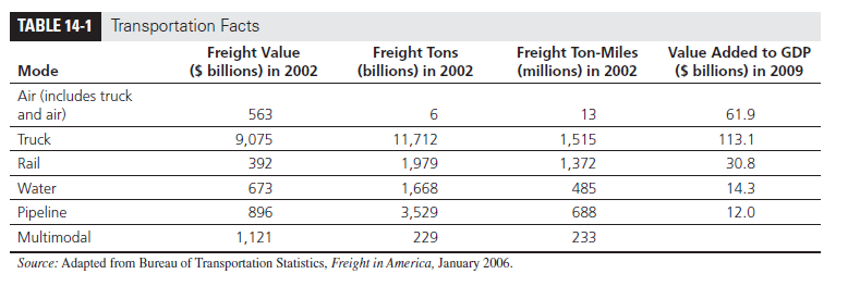 Commercial freight activity in the United States by mode in 2002, along with the value added by each mode to GDP in 2009, are summarized in Table 14-1.