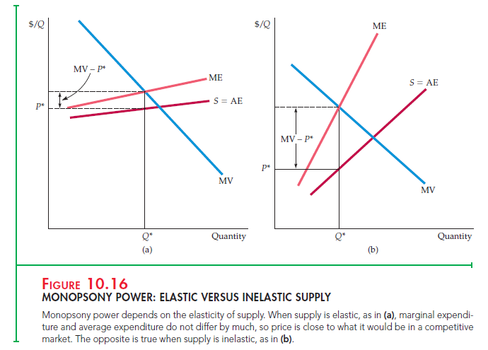 In a competitive market, price and marginal value are equal. A buyer with mon- opsony power, however, can purchase a good at a price below marginal value. The extent to which price is marked down below marginal value depends on the elastic-ity of supply facing the buyer.16 If supply is very elastic (E is large), the markdown will be small and the buyer will have little monopsony power. Conversely, if sup-ply is very inelastic, the markdown will be large and the buyer will have consider-able monopsony power. Figures 10.16(a) and 10.16(b) illustrate these two cases.