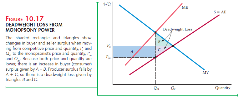 With monopsony, the price is lower and less is sold. Because of the lower price, sellers lose an amount of surplus given by rectangle A. In addition, sell-ers lose the surplus given by triangle C because of the reduced sales. The total loss of producer (seller) surplus is therefore A + C. By buying at a lower price, the buyer gains the surplus given by rectangle A. However, the buyer buys less, Qm instead of Qc, and so loses the surplus given by triangle B. The total gain in surplus to the buyer is therefore A − B. Altogether, there is a net loss of surplus given by B + C. This is the deadweight loss from monopsony power. Even if the monopsonist’s gains were taxed away and redistributed to the producers, there would be an inefficiency because output would be lower than under competi-tion. The deadweight loss is the social cost of this inefficiency.