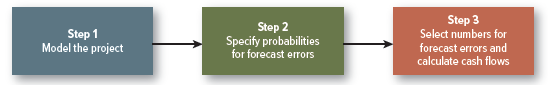 Step 3: Simulate the Cash Flows The computer now samples from the distribution of the forecast errors, calculates the resulting cash flows for each period, and records them. After many iterations, you begin to get accurate estimates of the probability distributions of the project cash flows—accurate, that is, only to the extent that your model and the probability distributions of the forecast errors are accurate. Remember the GIGO principle: “garbage in, garbage out.”