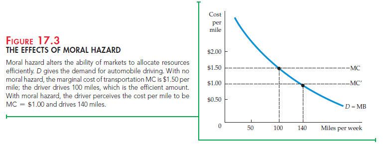 Moral hazard not only alters behavior; it also creates economic inefficiency. The inefficiency arises because the insured individual perceives either the cost or the benefit of the activity differently from the true social cost or benefit. In the driving example of Figure 17.3, the efficient level of driving is given by the intersection of the marginal benefit (MB) and marginal cost (MC) curves. With moral hazard, however, the individual’s perceived marginal cost (MC’) is less than actual cost, and the number of miles driven per week (140) is higher than the efficient level at which marginal benefit is equal to marginal cost (100).