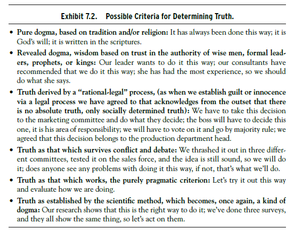 A useful dimension for comparing groups on their approach to reality testing is an adaptation of England’s (1975) moralism-pragmatism dimension. In his study of managerial values, England found that managers in different countries tended to be either pragmatic, seeking validation in their own experience, or moralistic, seeking validation in a general philosophy, moral system, or tradition. For example, he found that Europeans tended to be more moralistic, whereas Americans tended to be more pragmatic. If we apply this dimension to the basic underlying assumptions that a group makes, we can specify different bases for defining what is true, as shown in Exhibit 7.2.