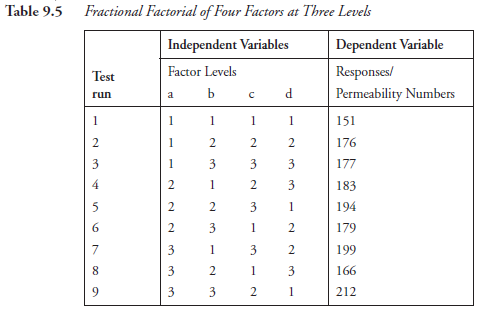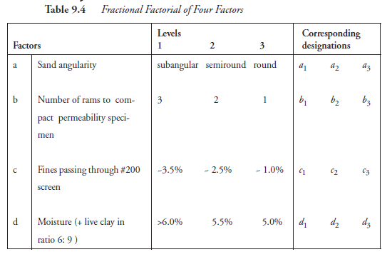 Table 9.4 shows, in summary, the four factors at three levels each forming the fractional factorial for the experiment.