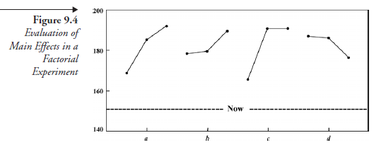 The main effect of c between levels 1 and 2 is 190 — 165 = 25, and that between levels 2 and 3 is 190 — 190 = 0. Represented to scale on the _y-axis (the x-axis has no scale), such effects are shown for all the factors in Figure 9.4.
