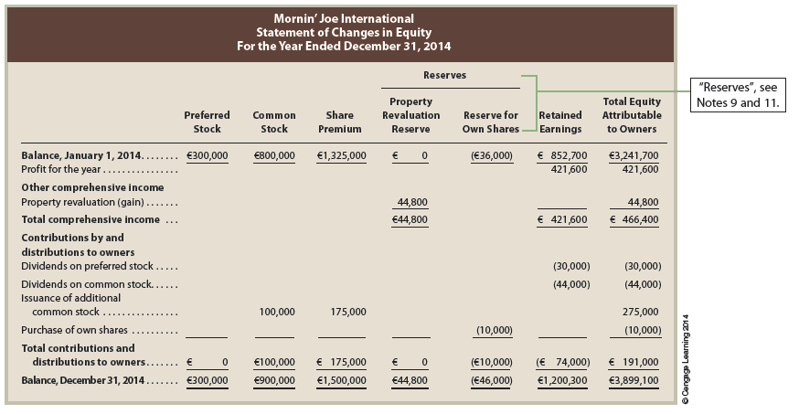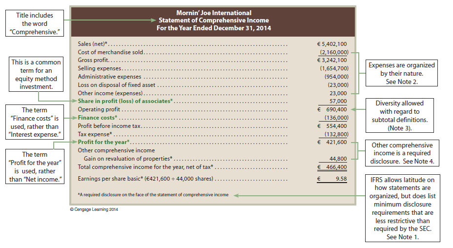 The following Mornin’ Joe International financial statements are simplified and illustrate only portions of IFRS that are appropriate for introductory accounting. The financial statements are presented in euros (€) for demonstration purposes only. The euro is the standard currency of the European Union. The euro is translated at a 1:1 ratio from the dollar to simplify comparisons. Throughout the illustration, callouts and end notes to each statement are used to highlight the differences between financial statements prepared under IFRS and under U.S. GAAP.