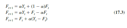 Despite the fact that exponential smoothing provides a forecast that is a weighted average of all past observations, all past data do not need to be saved to compute the forecast for the next period. In fact, equation (17.2) shows that once the value for the smoothing constant a is selected, only two pieces of information are needed to compute the forecast: Yt, the actual value of the time series in period t, and Ft, the forecast for period t.