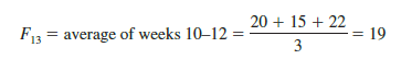 To forecast sales in week 13, the next time period in the future, we simply compute the average of the time series values in weeks 10, 11, and 12.
