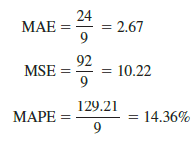 Forecast Accuracy In Section 17.2 we discussed three measures of forecast accuracy: MAE, MSE, and MAPE. Using the three-week moving average calculations in Table 17.9, the values for these three measures of forecast accuracy are