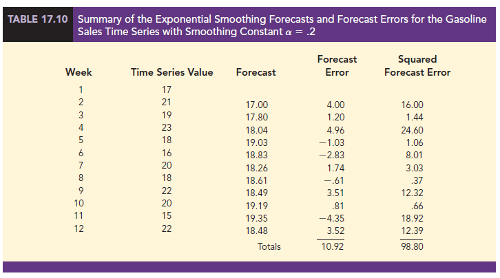 The criterion we will use to determine a desirable value for the smoothing constant a is the same as the criterion we proposed for determining the order or number of periods of data to include in the moving averages calculation. That is, we choose the value of a that minimizes the MSE. A summary of the MSE calculations for the exponential smoothing forecast of gasoline sales with a = .2 is shown in Table 17.10. Note that there is one less squared error term than the number of time periods because we had no past values with which to make a forecast for period 1. The value of the sum of squared forecast errors is 98.80; hence MSE = 98.80/11 = 8.98. Would a different value of a provide better results in terms of a lower MSE value? Perhaps the most straightforward way to answer this question is simply to try another value for a. We will then compare its mean squared error with the MSE value of 8.98 obtained by using a smoothing constant of a = .2.