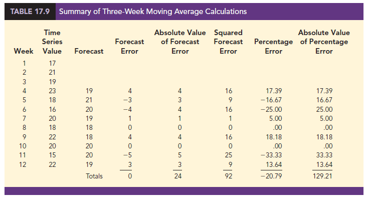 In Section 17.2 we also showed that using the most recent observation as the forecast for the next week (a moving average of order k = 1) resulted in values of MAE = 3.73, MSE = 16.27, and MAPE = 19.24%. Thus, in each case the three-week moving average approach provided more accurate forecasts than simply using the most recent observation as the forecast.