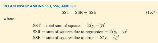 Because of the computational difficulty in computing the three sums of squares, we rely on computer packages to determine those values. The analysis of variance part of the output in Figure 15.4 shows the three values for the Butler Trucking problem with two independent variables: SST = 23.900, SSR = 21.6006, and SSE = 2.2994. With only one independent variable (number of miles traveled), the output in Figure 15.3 shows that SST = 23.900, SSR = 15.871, and SSE = 8.029. The value of SST is the same in both cases because it does not depend on y, but SSR increases and SSE decreases when a second independent variable (number of deliveries) is added. The implication is that the estimated multiple regression equation provides a better fit for the observed data.