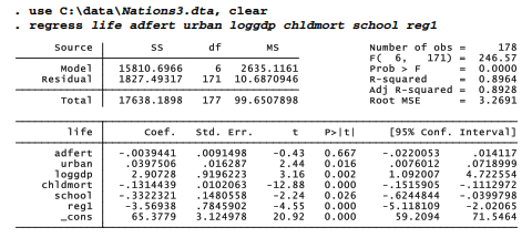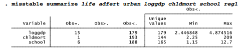 Nations3.dta contains information about 194 countries, but missing values restrict our analysis in previous sections to a subset of 178 that have complete information on all variables of interest. This listwise deletion approach of setting aside incomplete observations is, out of necessity, a common statistical practice. Its known drawbacks include loss of observations and statistical power. If the observations with missing values differ systematically from other observations, listwise deletion could also bias coefficient estimates.