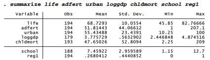 Three of the variables in this analysis — loggdp, chldmort and school — have missing values that in combination reduce the available sample from 194 to 178 observations.