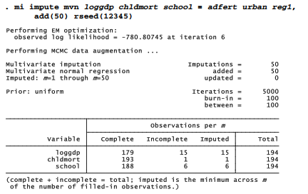 The next step does actual imputation. Missing values of loggdp, chldmort and school (the mi register imputed variables) are imputed by regression on the mi register regular variables regl, adfert and urban. We use a multivariate normal (mvn) regression method. There will be 50 separate imputations denoted as m = 0 (the original data with missing values) or m = 1 through m = 50, each of which contains imputations for the 16 observations that originally had missing values. Thus, 50*16 = 800 observations will be added to the data, making a total of 194 + 800 = 964 observations.