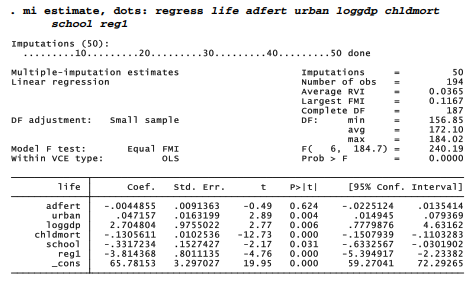 A final step uses these imputations to regress life expectancy on the 6 predictors. In principle the imputation process results in estimates that are more efficient (lower standard errors) and less biased than our earlier regression which dropped all observations with missing values.