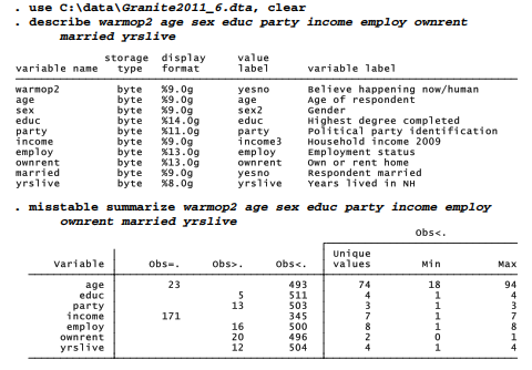 Ten variables from Granite2011_06.dta will be used in this analysis. Four of these (employ, ownrent, married and yrslive) hold no theoretical interest with respect to climate change beliefs, but might prove helpful for imputing the missing values of income.