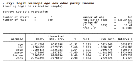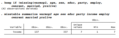 Although we listed warmop2, sex and married in the misstable command, Stata detects that they have no missing values and does not include them in the output. On the other hand, out of 516 interviews, we have 171 missing values on income. If we regress the dichotomous variable warmop2 on income along with the usual suspects, our estimation sample includes just 340 observations.