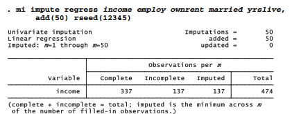 137 observations with missing income values are predicted by regression on employ, ownrent, married and yrslive. Fifty sets of imputed values are created, each with these 137 predicted values plus random noise. The imputations are then pooled to estimate a new logit regression model.
