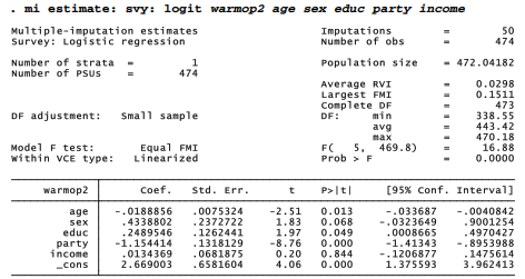 Following multiple imputation, the logit coefficient on party remains similar (-1.15 compared with the previous -1.18), and still statistically significant. Other results show greater change, including shifts in coefficients but also generally smaller standard errors, reflecting more precise estimates from the imputation-enhanced data. Through these changes the coefficients on age (negative) and educ (positive) now appear statistically significant as well, in keeping with results from many previous studies of climate-change beliefs. income, on the other hand, shows little effect in either the pre- or post-imputation model. That finding could support a decision to leave income out of a final model, and focus on other more important and less troublesome predictors.
