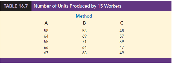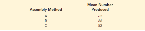A random sample of 15 employees was selected, and each of the three assembly methods was randomly assigned to 5 employees. The number of units assembled by each employee is shown in Table 16.7. The sample mean number of units produced with each of the three assembly methods is as follows: