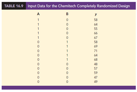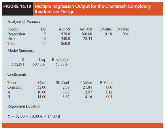 In Section 15.7 we discussed the use of dummy variables in multiple regression analysis. In this section we show how the use of dummy variables in a multiple regression equation can provide another approach to solving experimental design problems. We will demonstrate the multiple regression approach to experimental design by applying it to the Chemitech, Inc., completely randomized design.