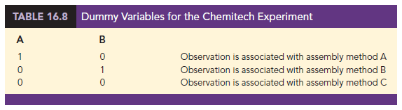 We begin the regression approach to this problem by defining dummy variables that will be used to indicate which assembly method was used. Because the Chemitech problem has three assembly methods or treatments, we need two dummy variables. In general, if the factor being investigated involves k distinct levels or treatments, we need to define k – 1 dummy variables. For the Chemitech experiment we define dummy variables A and B as shown in Table 16.8.