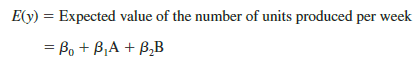 We now want to estimate the coefficients β0, β1, and β2 and hence develop an estimate of the mean number of units assembled per week for each method. Table 16.9 shows the sample data, consisting of 15 observations of A, B, and y. Figure 16.18 shows the corresponding multiple regression output. We see that the estimates of β0, β1, and β2 are b0 = 52, b1 = 10, and b2 = 14. Thus, the best estimate of the mean number of units assembled per week for each assembly method is as follows: