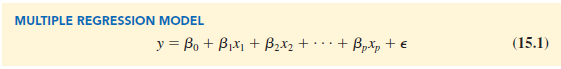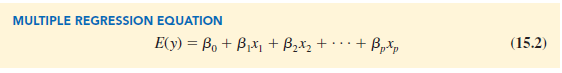 In Section 15.4 we will discuss the assumptions for the multiple regression model and ∈. One of the assumptions is that the mean or expected value of e is zero. A consequence of this assumption is that the mean or expected value of y, denoted E( y), is equal to β0 + β1 x1 + β2x2 + . . . + βpxp. The equation that describes how the mean value of y is related to x1, x2, . . . , xp is called the multiple regression equation.