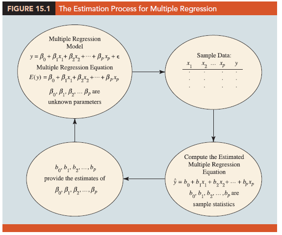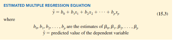 If the values of β0, β1, β2, … , βp were known, equation (15.2) could be used to compute the mean value of y at given values of x1, x2, . . . , xp. Unfortunately, these parameter values will not, in general, be known and must be estimated from sample data. A simple random sample is used to compute sample statistics β0, β1, β2,…, βp that are used as the point estimators of the parameters β0, βi, β2, …, βp. These sample statistics provide the following estimated multiple regression equation.